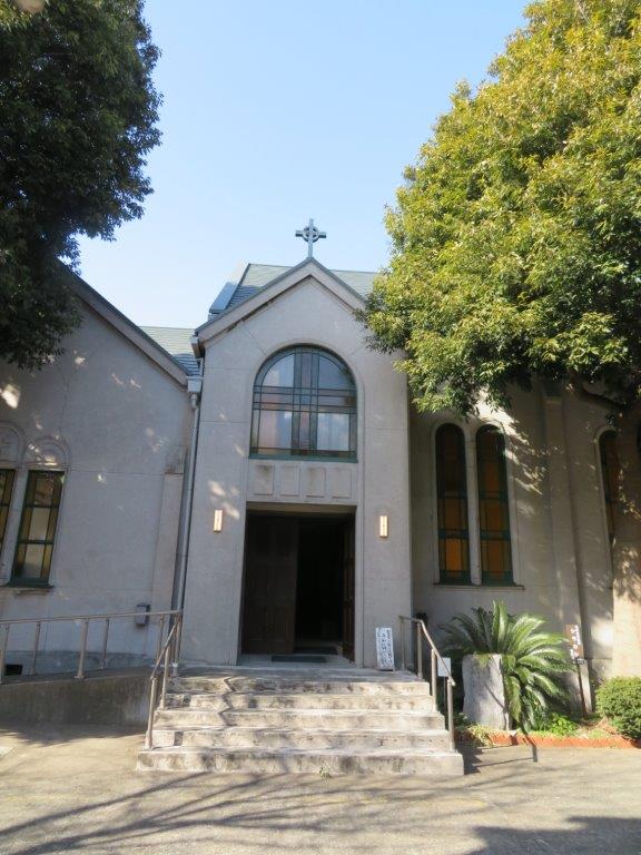 左手が聖堂です。ここでは毎日曜日のミサをはじめ主な祭事が行われる祈りの場です。どなたでも入ってお祈りすることができます。